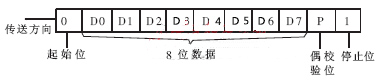 每字節(jié)含8位2進(jìn)制碼,傳輸時(shí)加上一個(gè)起始位(0),一個(gè)偶校驗(yàn)位和一個(gè)停止位(1),共11位,其傳輸序列如下圖: