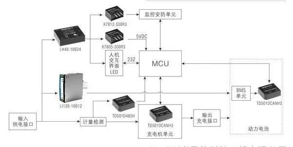 電源部分中,首先需考慮大電流充電情況下BMS的輔助供電。在最新的國(guó)標(biāo)中將此電源統(tǒng)一標(biāo)定為12V10A的電源,且后續(xù)在BMS管理方面,乘用車與大巴車的BMS供電系統(tǒng)將統(tǒng)一標(biāo)準(zhǔn)。因此,此處推薦選擇具有主動(dòng)式PFC功能的LI120-10B12輸出12V給BMS系統(tǒng)供電。
