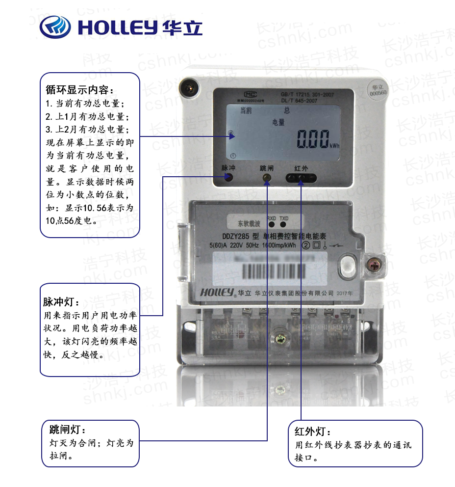 單相費(fèi)控智能電能表的面板和液晶顯示說(shuō)明:
